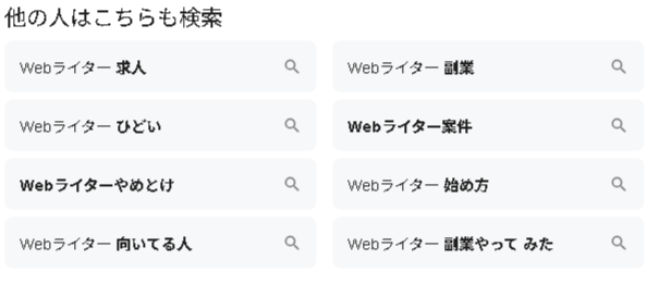 上の画像のように、Googleのサジェストや関連検索を確認すると、